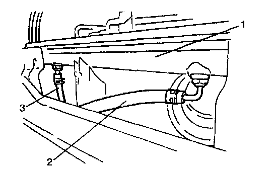 3. When servicing vehicle equipped with Automatic Transmission (A/T), place oil pan under radiator (1) and disconnect A/T fluid hoses (inlet hose (Outlet from oil cooler) (2), outlet hose (Inlet to oil cooler) (3) from radiator (1).