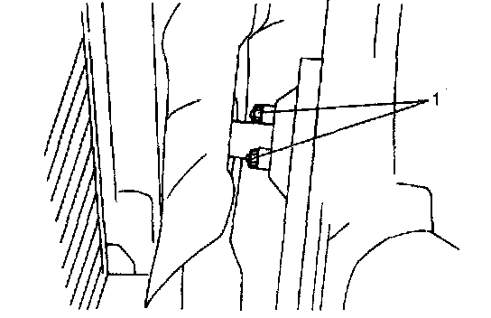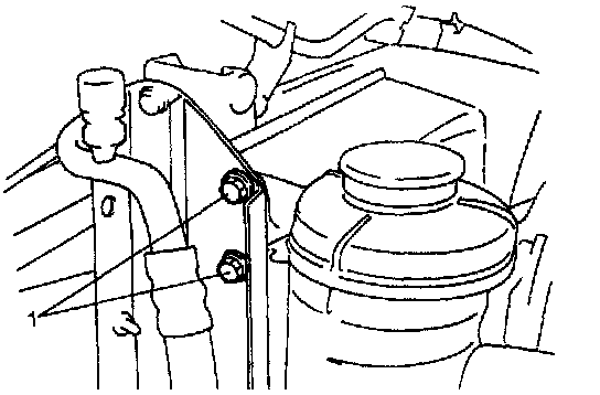 6. Remove P/S oil tank stay bolts (1) from radiator stay.