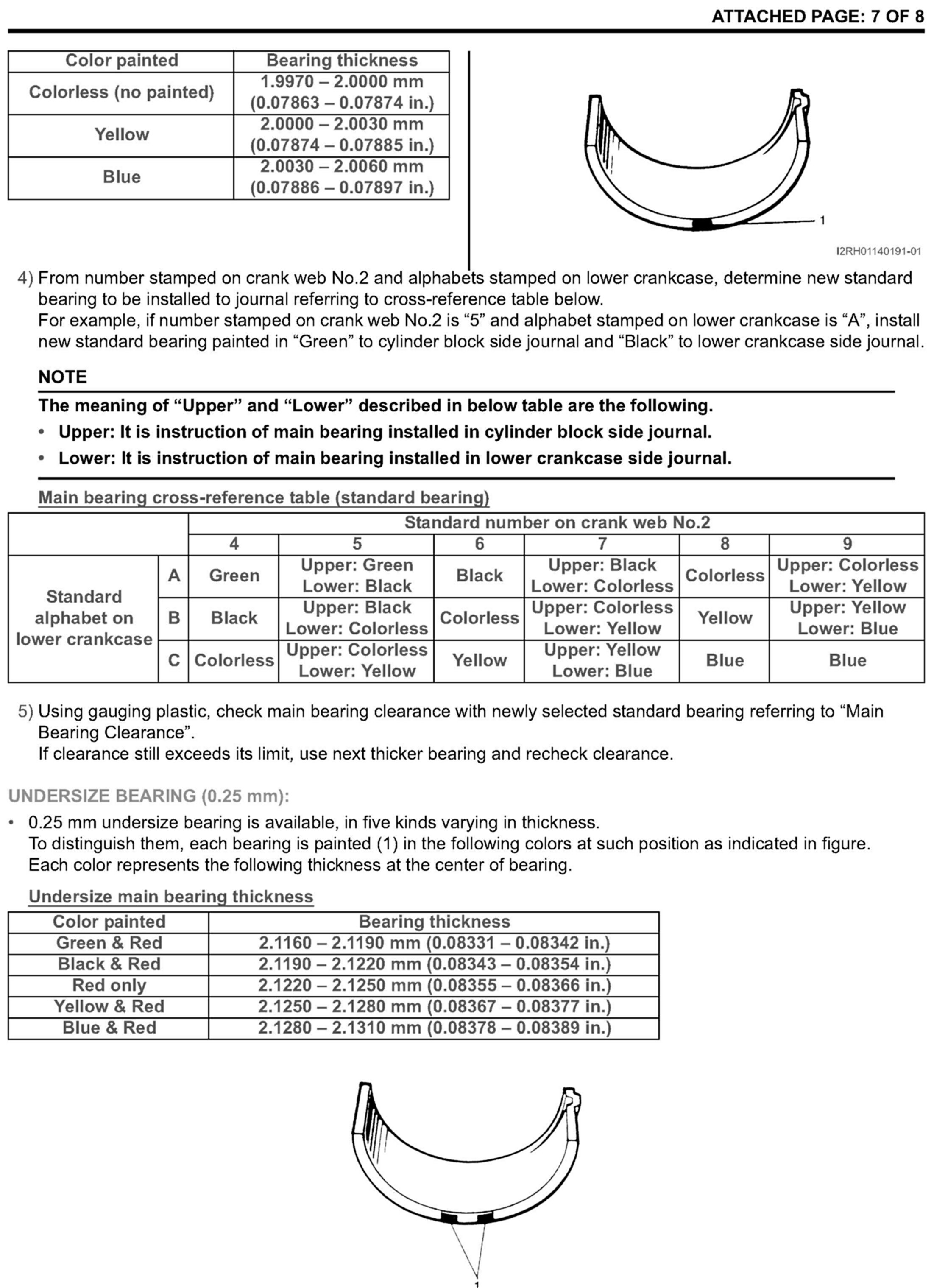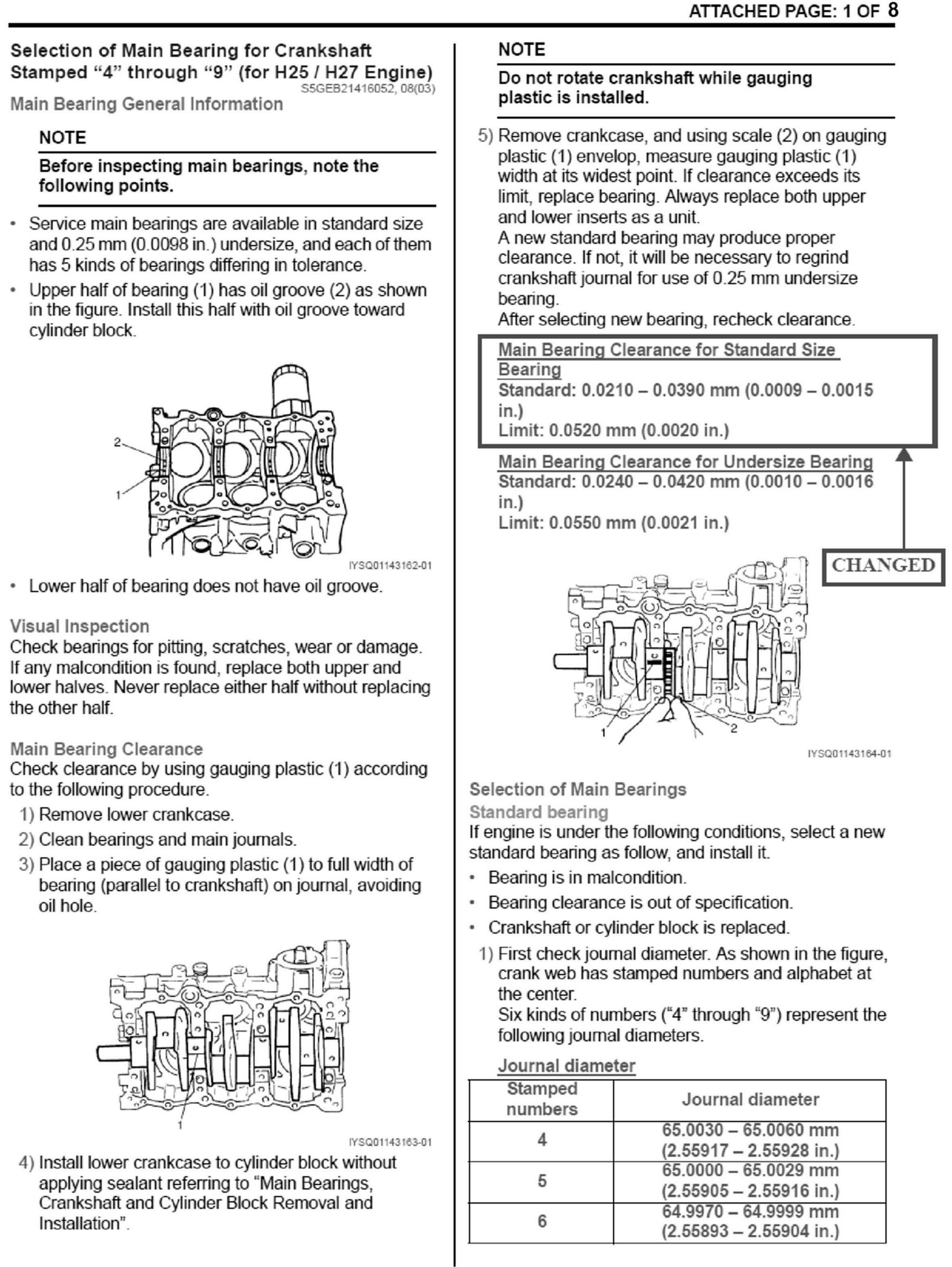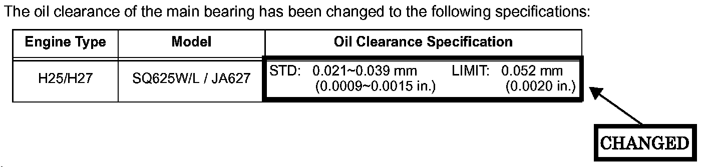 Main bearing oil clearance specification and main bearing selection chart in the Service Manual has been updated on the H25 and H27 engines. Please also see attached pages 1 thru 4.