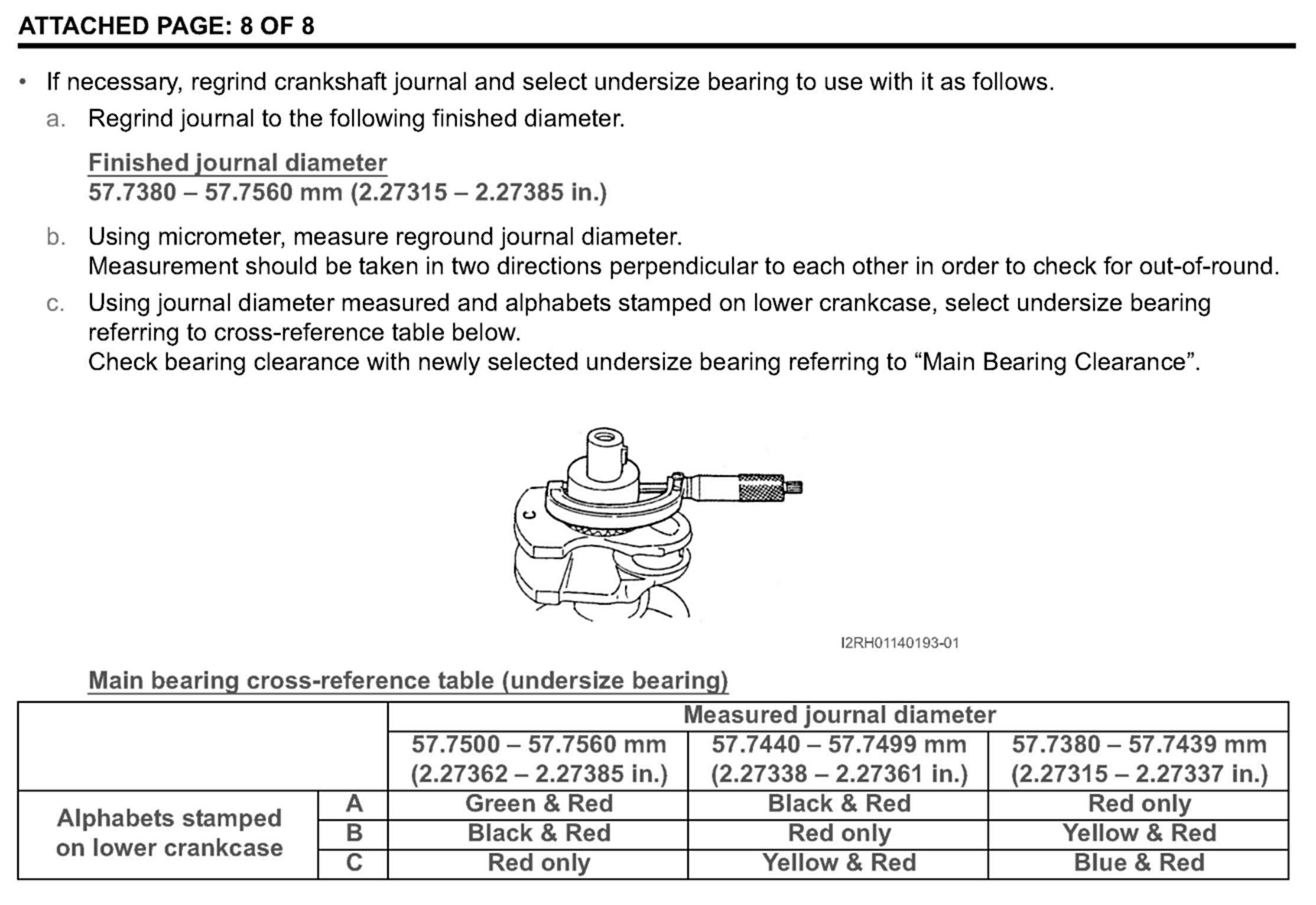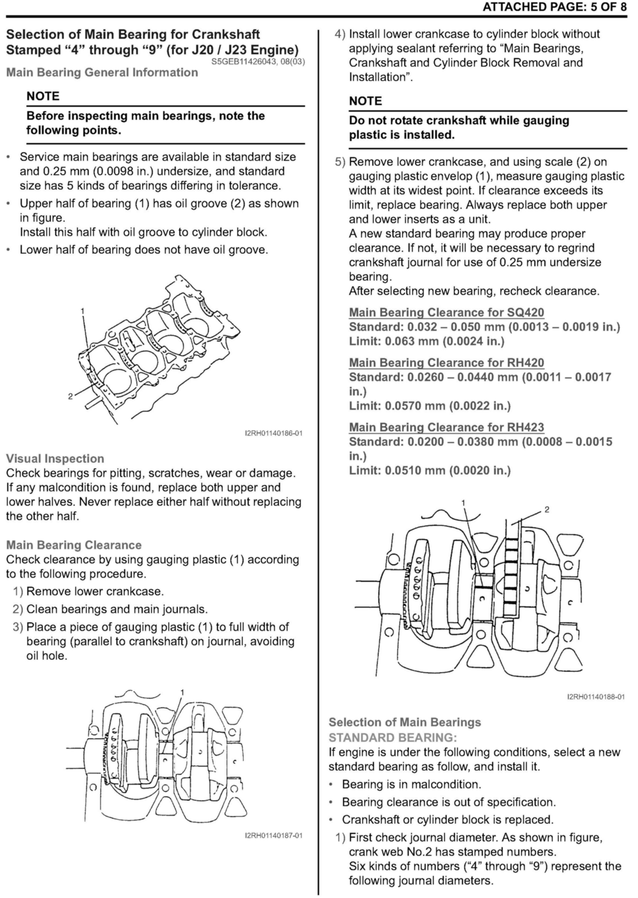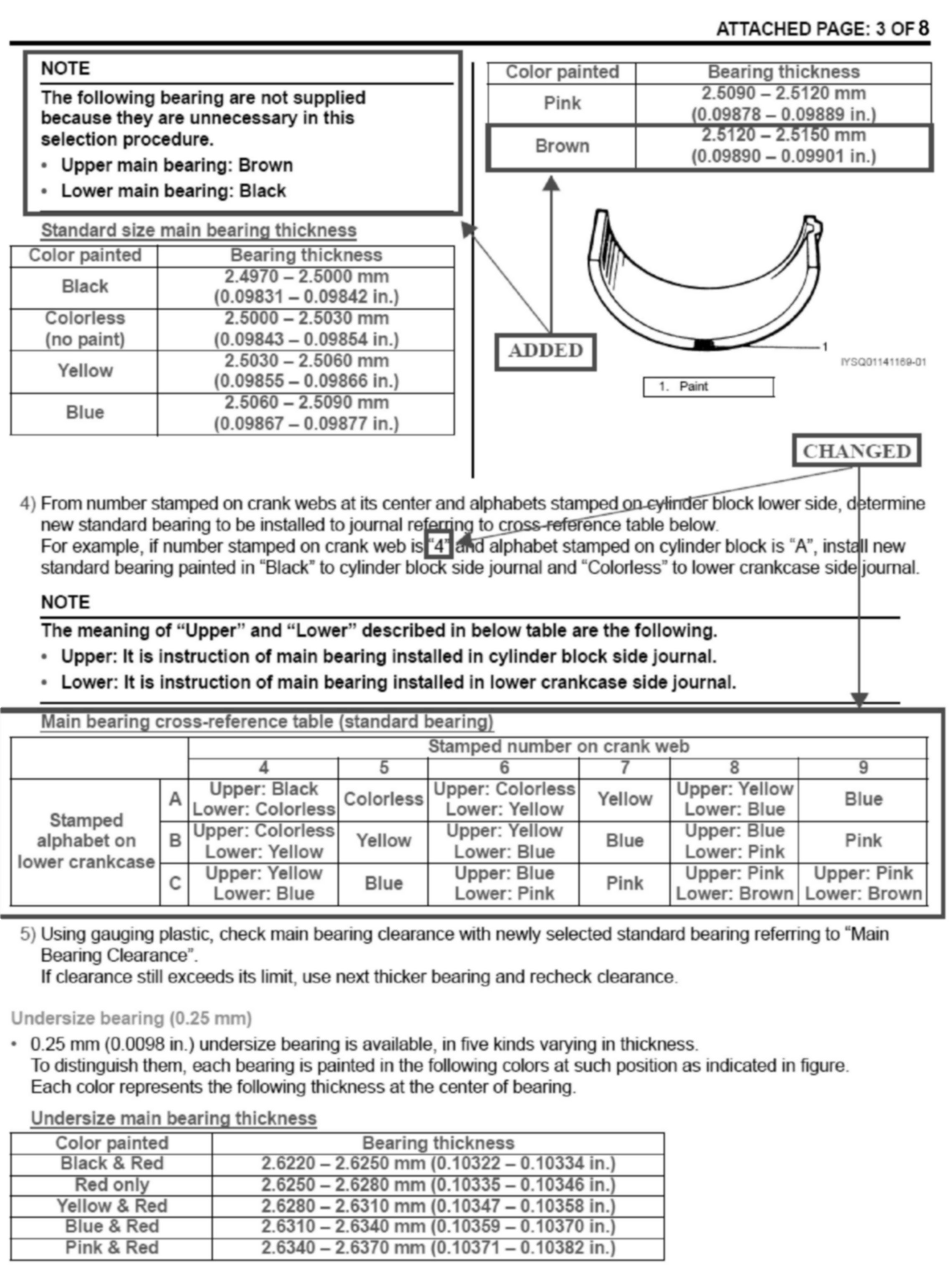 Main bearing oil clearance specification and main bearing selection chart in the Service Manual has been updated on the H25 and H27 engines. Please also see attached pages 1 thru 4.