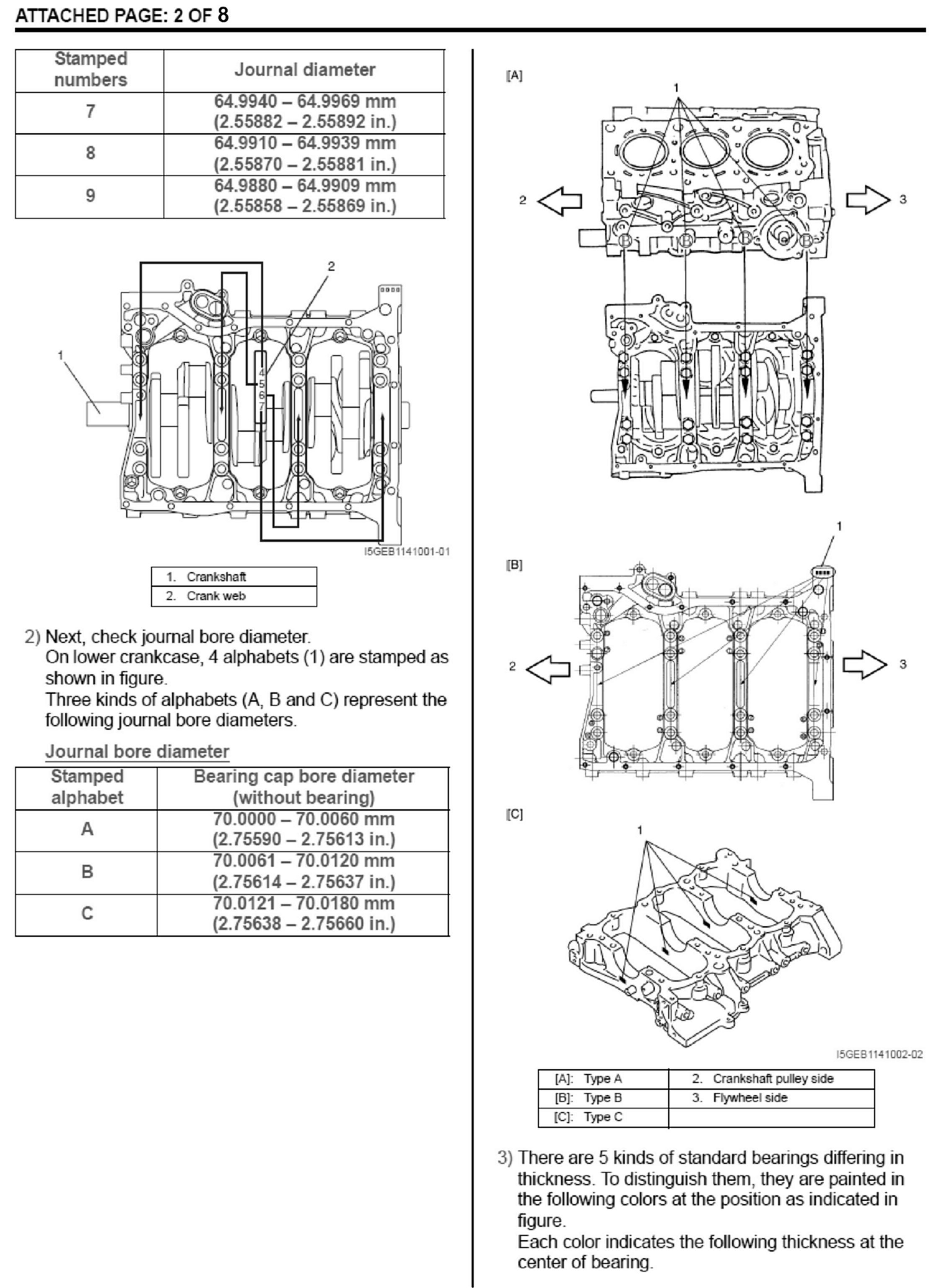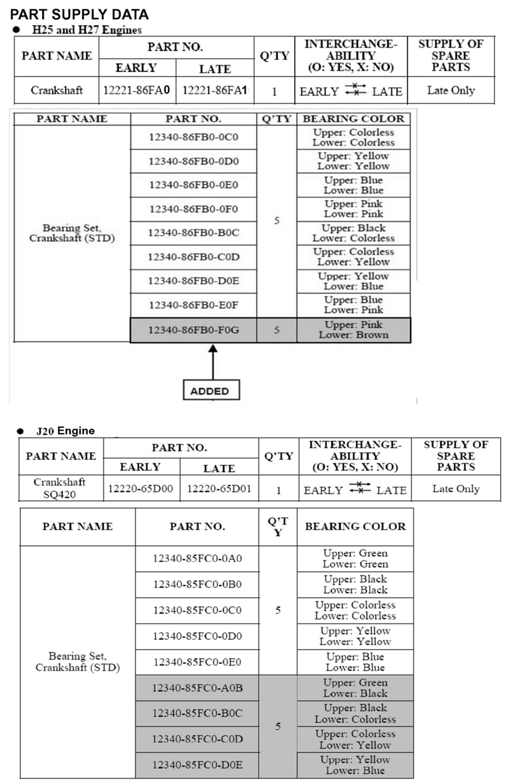 According to the change in oil clearance, new combinations of the crankshaft main bearings have been added as described in PART SUPPLY DATA" as shown.
