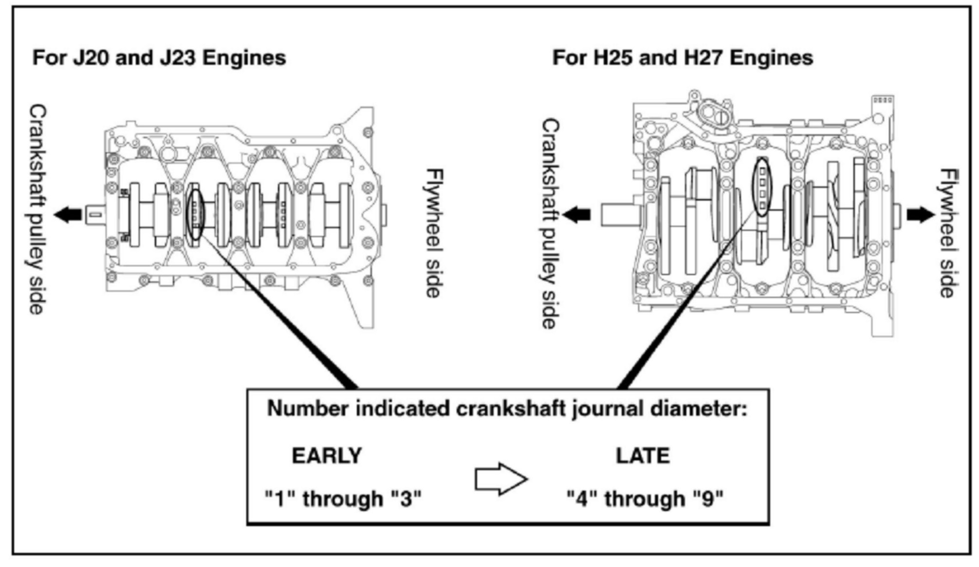 The crankshaft main bearing oil clearance for the H25 and H27 engines has been modified as well as the main bearing selection procedure.
