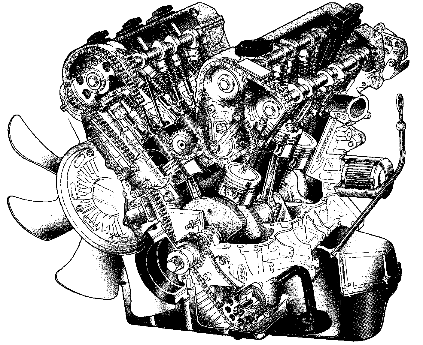 Engine General InformationThe engine is a water-cooled, 60° V6 cylinders, 4 stroke cycle gasoline unit with its Double overhead camshaft (DOHC) valve mechanism arranged for "V" type valve configuration. The double overhead camshaft is mounted over the cylinder head; it is driven from crankshaft through timing chains, and no push rods are provided in the valve train system.