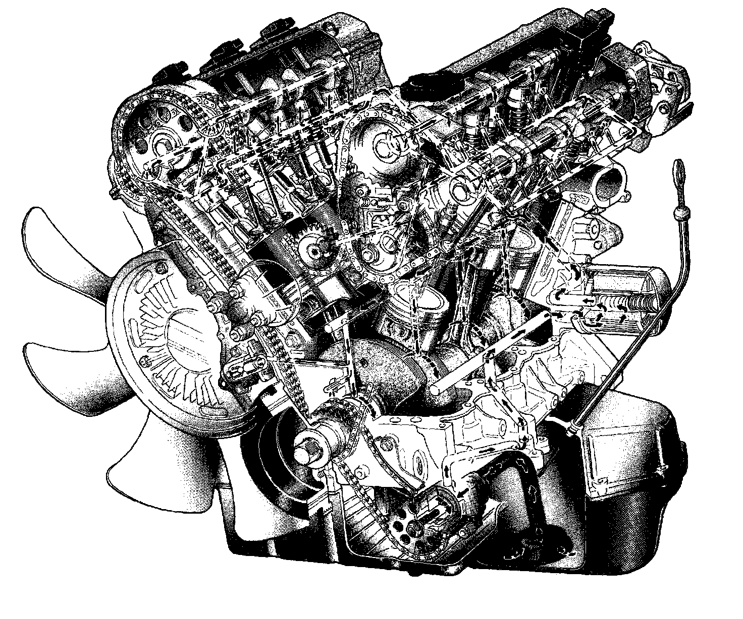 Engine LubricationThe oil pump is of a trochoid type, and mounted under the crankshaft. Oil is drawn up through the oil pump strainer and passed through the pump to the oil filter. The filtered oil flows into 3 paths in cylinder block.