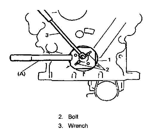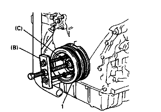 13. Remove crankshaft pulley bolt (1). To lock crankshaft pulley, use special tool (camshaft pulley holder) as shown in figure.