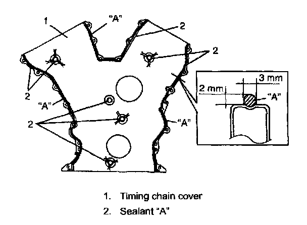 ^ Apply sealant "A" to timing chain cover sealing surface area as shown in the figure.