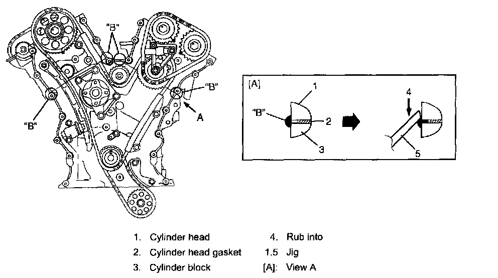 ^ Apply sealant"B" to mating surfaces of cylinder head and cylinder block as shown.