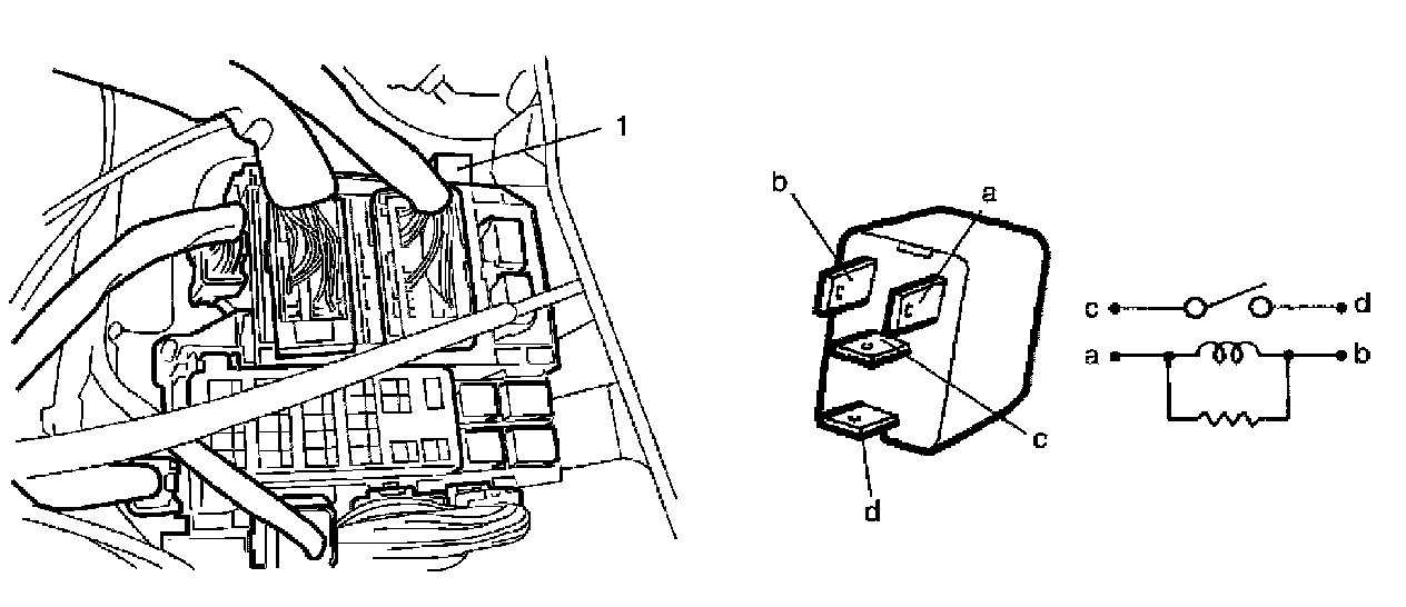 3. Check that there is no continuity between terminal "c" and "d". If there is continuity, replace relay.
