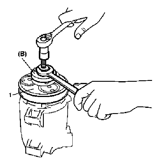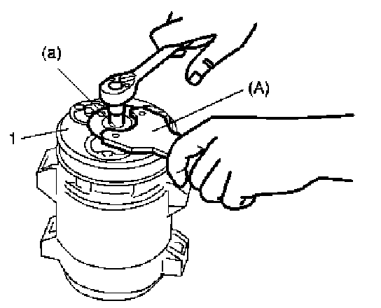 2. Fix armature plate (1) with special tool (A) and remove armature plate bolt.