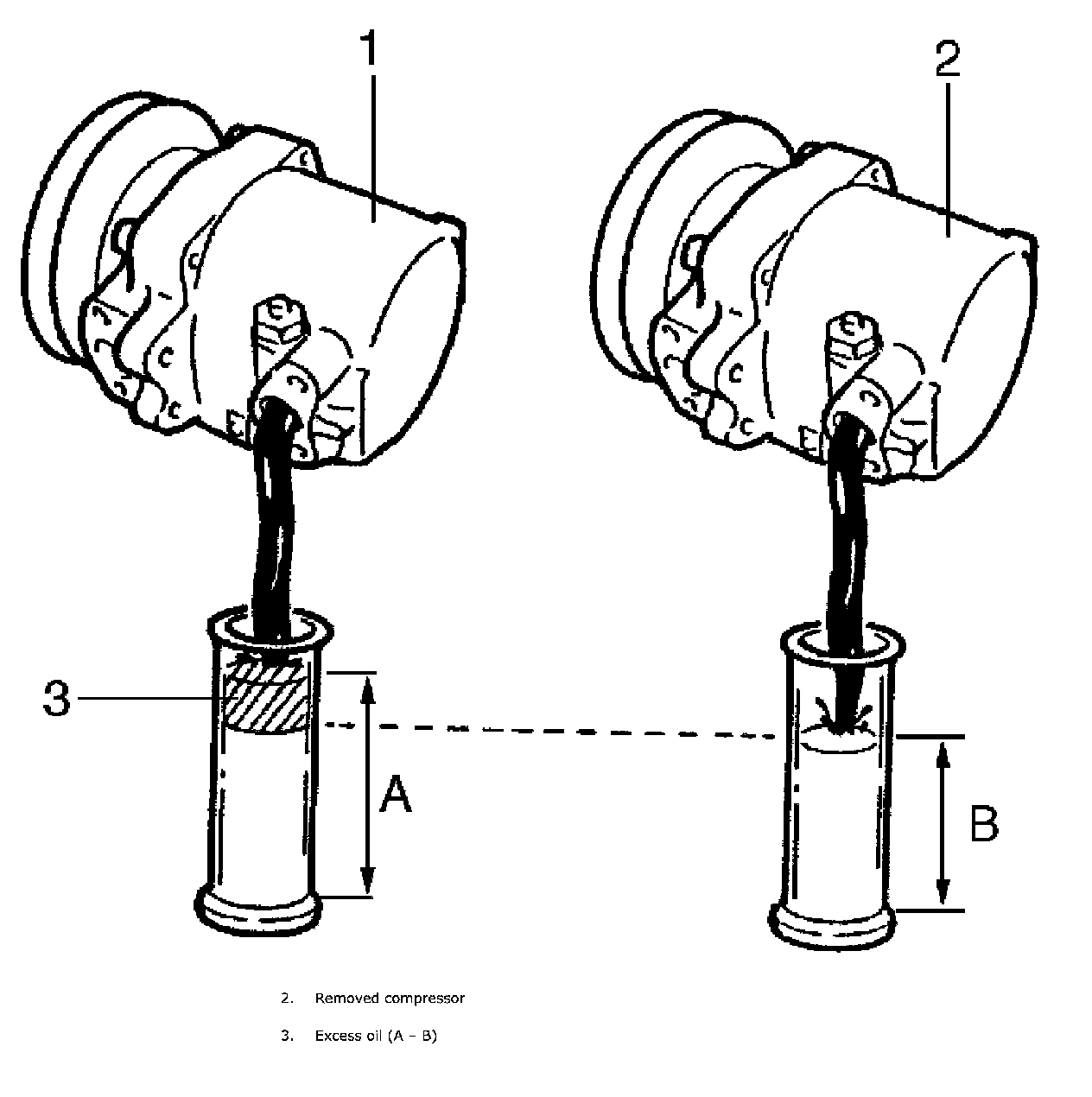 "B": Amount of oil remaining in removed compressor