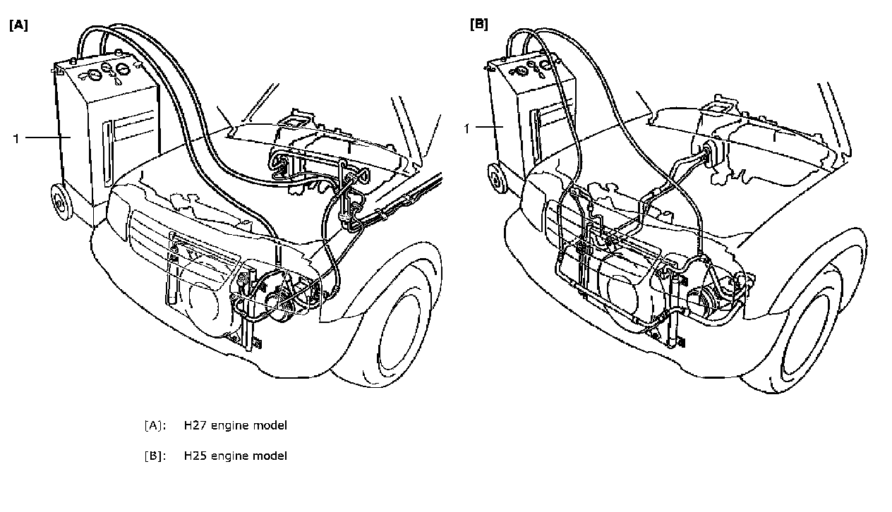 - When discharging refrigerant out of A/C system, always recover it by using refrigerant recovery and recycling equipment (1). Discharging it into atmosphere would cause adverse effect to environments.