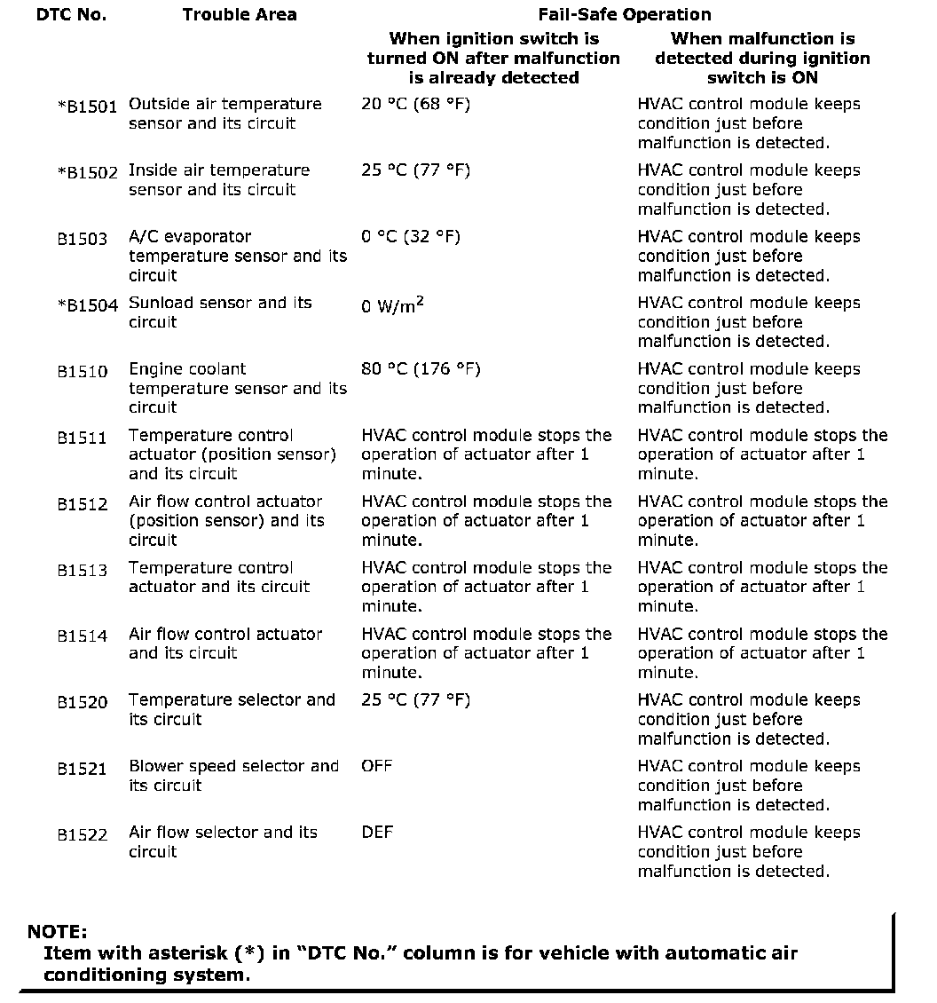 When any of the malfunctions (DTCs) is detected, HVAC control module enters fail-safe mode.