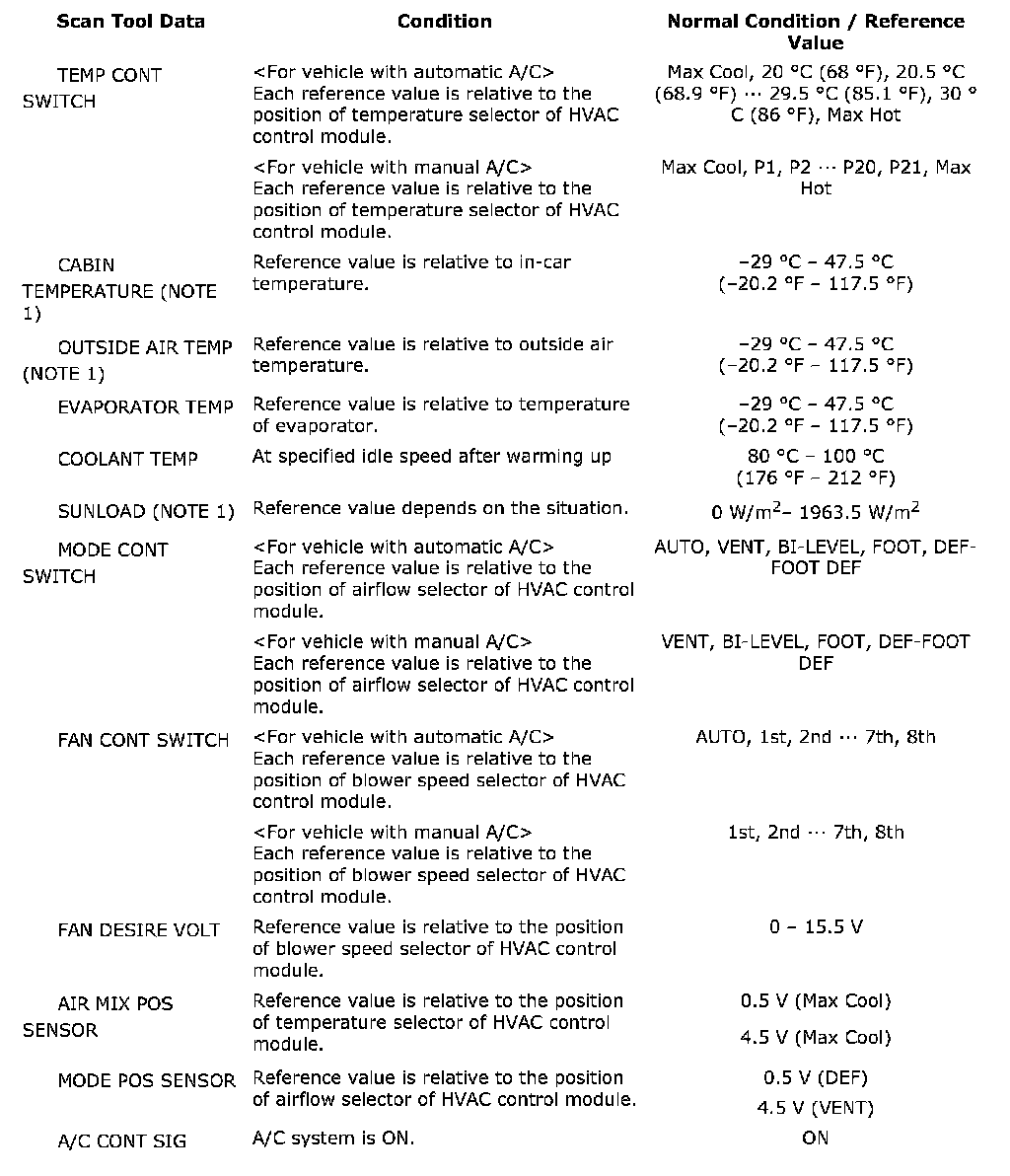 A/C CONT SIG (ON or OFF): State of A/C indicator lamp