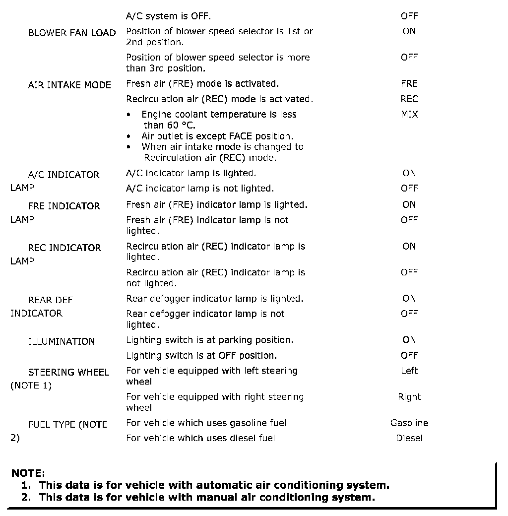 FUEL TYPE (GASOLINE or DIESEL) (for vehicle with automatic air conditioning model): Type of fuel which should be used