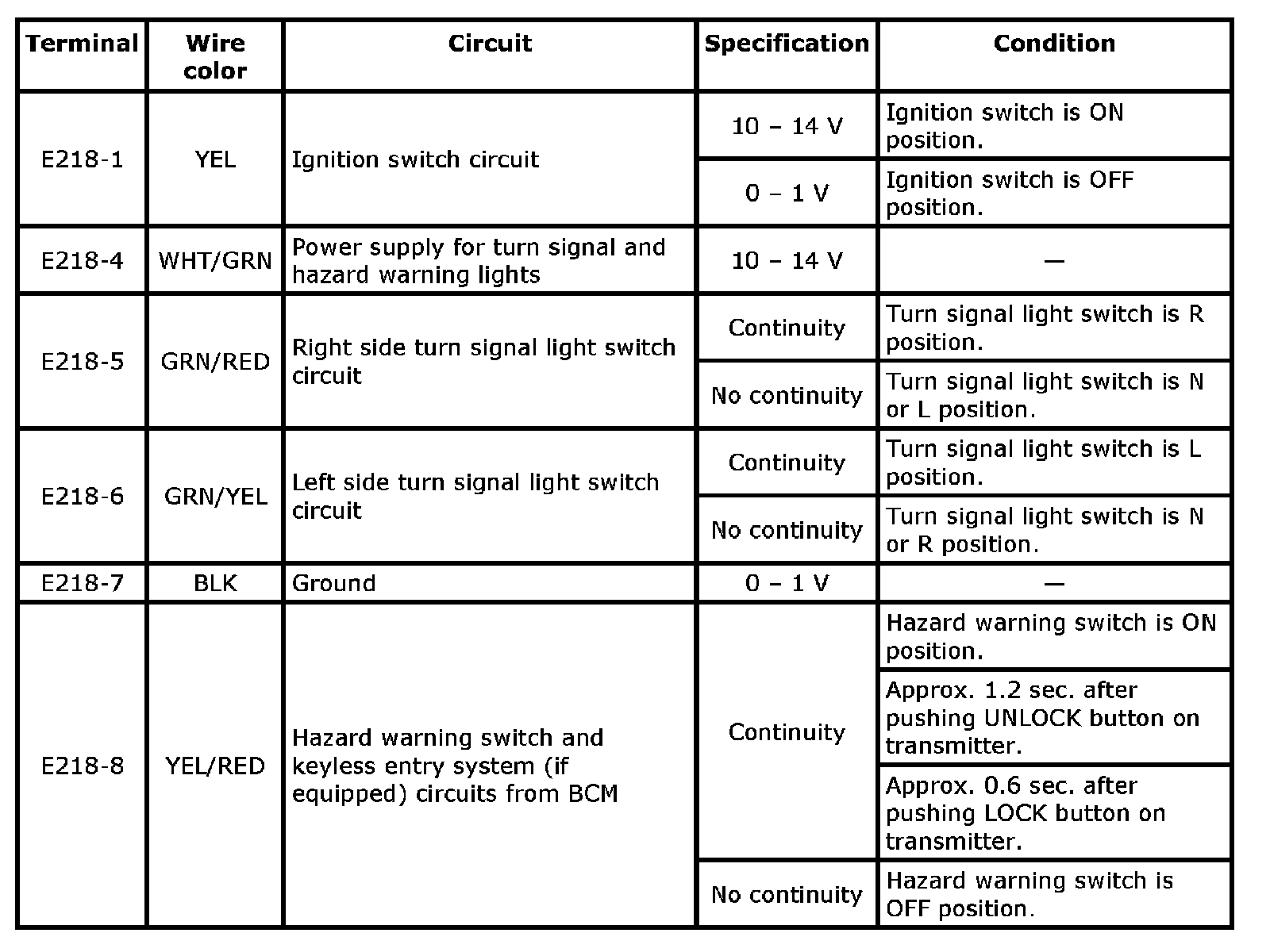 5. Check for voltage and continuity between the following each terminal and body ground under each condition. If check result is not as specified, repair applicable circuit. If all check result are OK, replace turn signal and hazard warning relay and recheck.