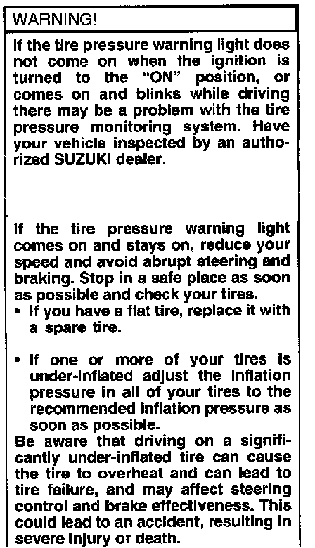 When the ignition switch is turned to the "ON" position, this light comes on briefly so you can check that the light is working. When the tire pressure monitoring system warning light is lit, one or more of your tires is significantly under-inflated. You should stop and check your tires as soon as possible, and inflate them to the proper pressure as indicated on the vehicle's tire information placard. Driving on a significantly under-inflated tire causes the tire to overheat and can lead to tire failure. Under-inflation also reduces fuel efficiency and tire tread life, and may affect the vehicle's handling and stopping ability. Each tire, including the spare, should be checked at least once a month when cold and set to the recommended inflation pressure as specified in the vehicle placard and owner's manual.