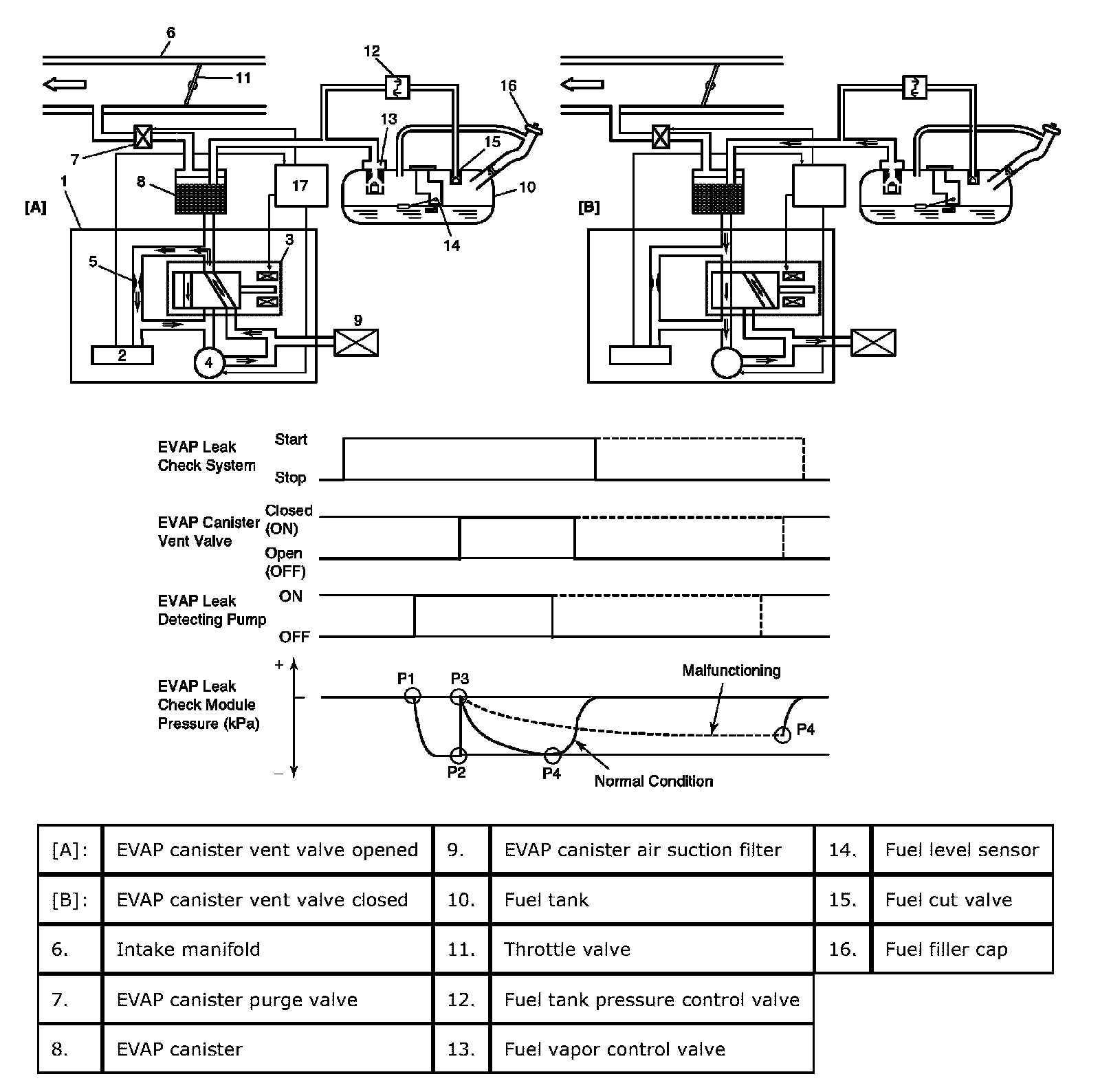 3. ECM measures tank pressure as EVAP system maximum pressure (P3) when EVAP canister vent valve is closed (ON) [B] with EVAP leak detecting pump operated.