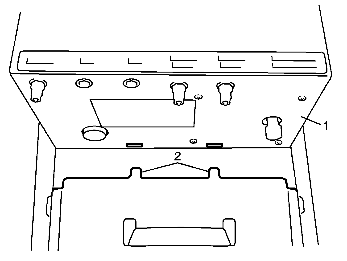 2. Bring the tester (1) up through the EVAP cart's handlebar, and place it on the two tabs (2) located on the bracket on the EVAP cart.