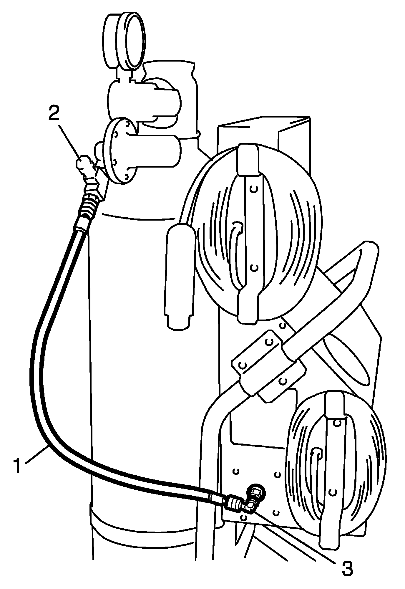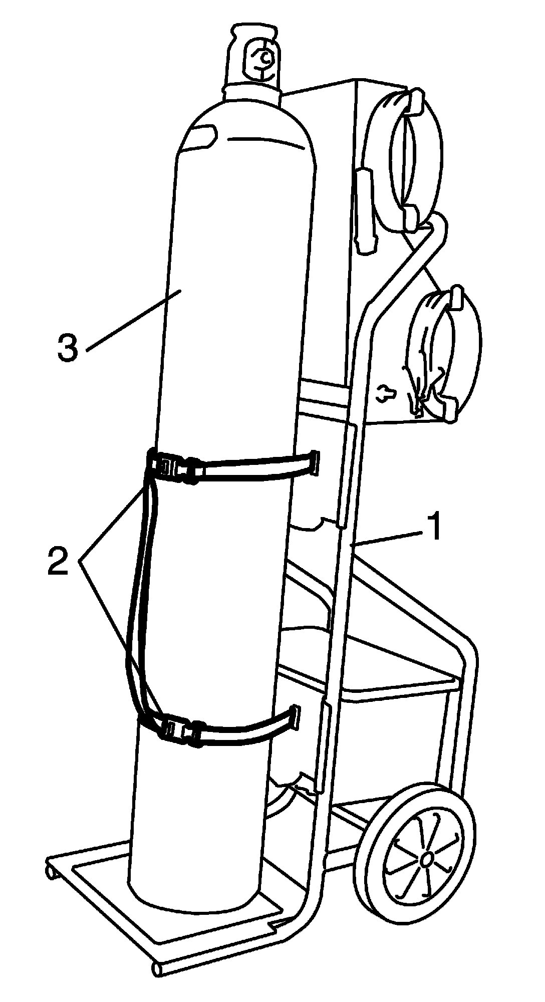 4. Attach the nitrogen tank (3) securely to the EVAP cart (1) by using the tank fixing bands (2) that should be attached to the EVAP cart (1).