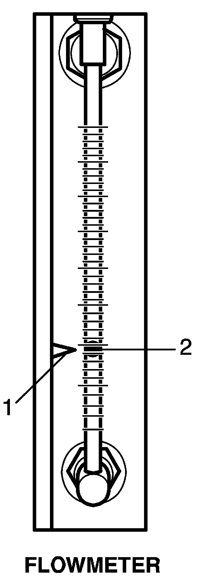 5. Position the red flag (1) on the flow meter to align with the floating indicator (2). When the red flag is set, press and release the remote switch to deactivate the tester.