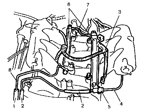 5. Remove fuel feed pipe (8) and fuel connect pipe (7) from delivery pipes (6) (right and left).