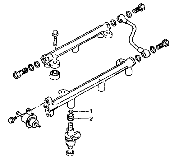 6. Install fuel feed pipe (2) and tighten union bolt to specified torque with new gaskets.