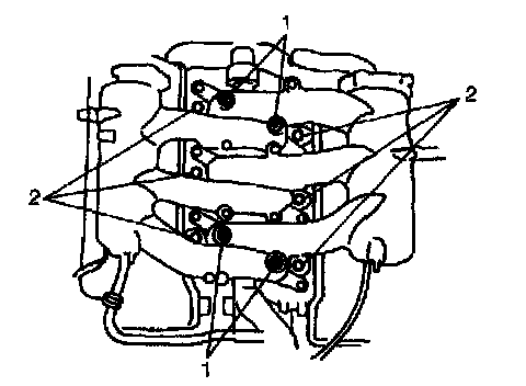 2. Check if insulator (1) is scored or damaged. If it is, replace with new one. Install insulators and cushions (2) to intake manifold.