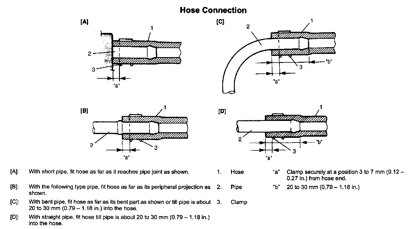 - Fuel or fuel vapor hose connection varies with each type of pipe. When reconnecting fuel or fuel vapor hose, be sure to connect and clamp each hose correctly referring to figure "Hose Connection".