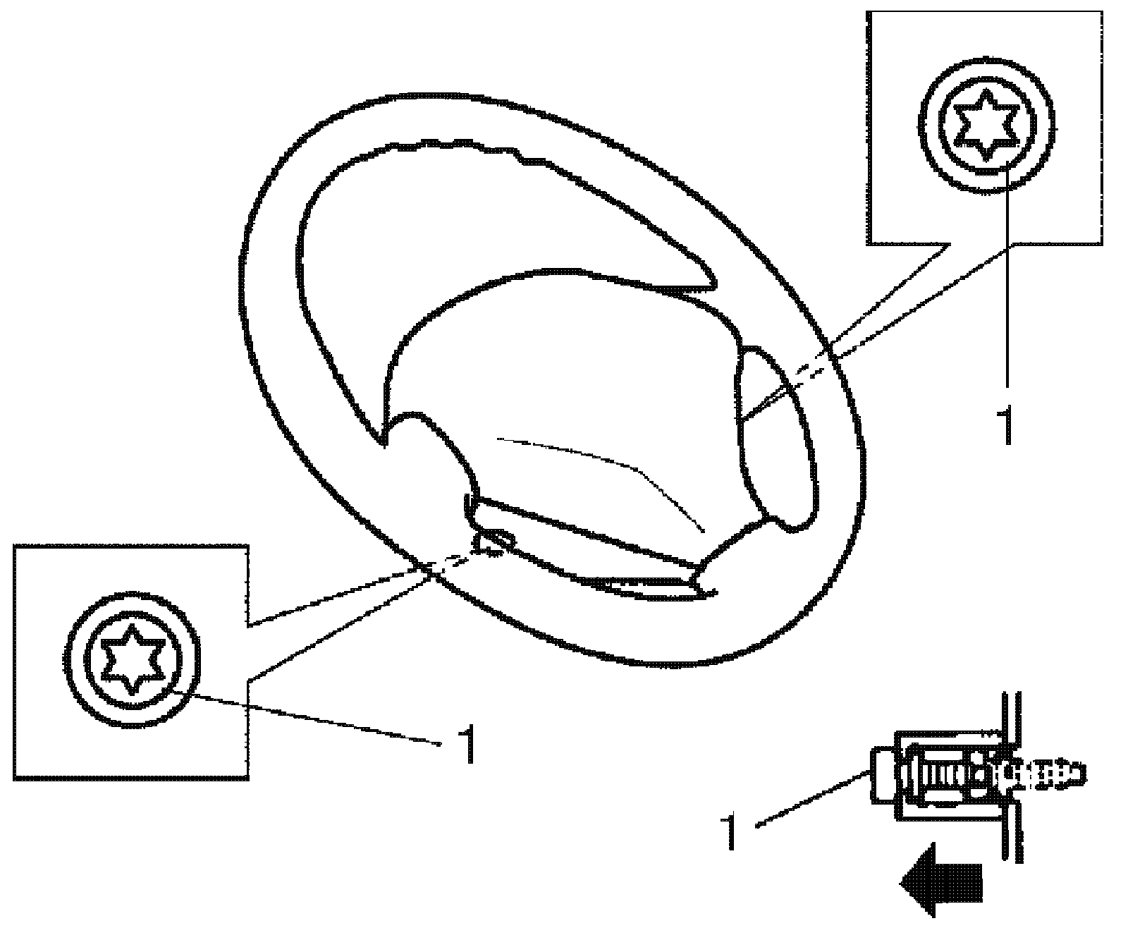 3. Loosen driver air bag (inflator) module mounting bolts (1) till it turns freely, pull them out and fix them to bolt clamps.