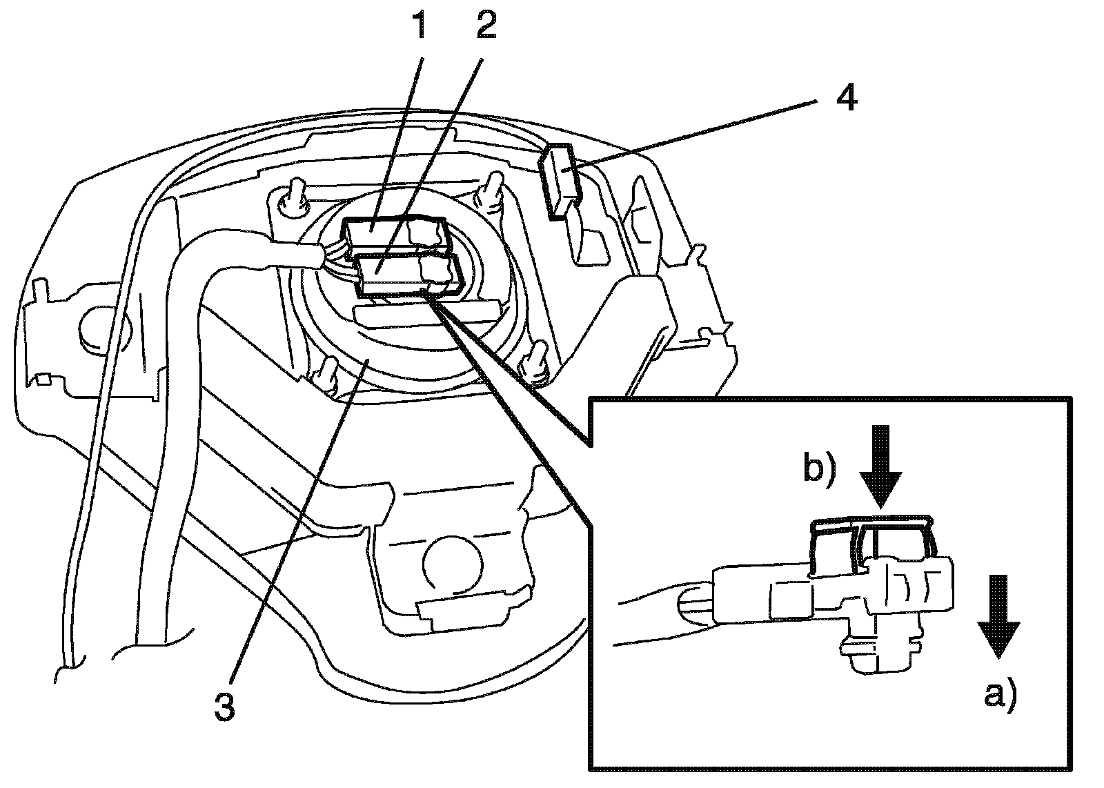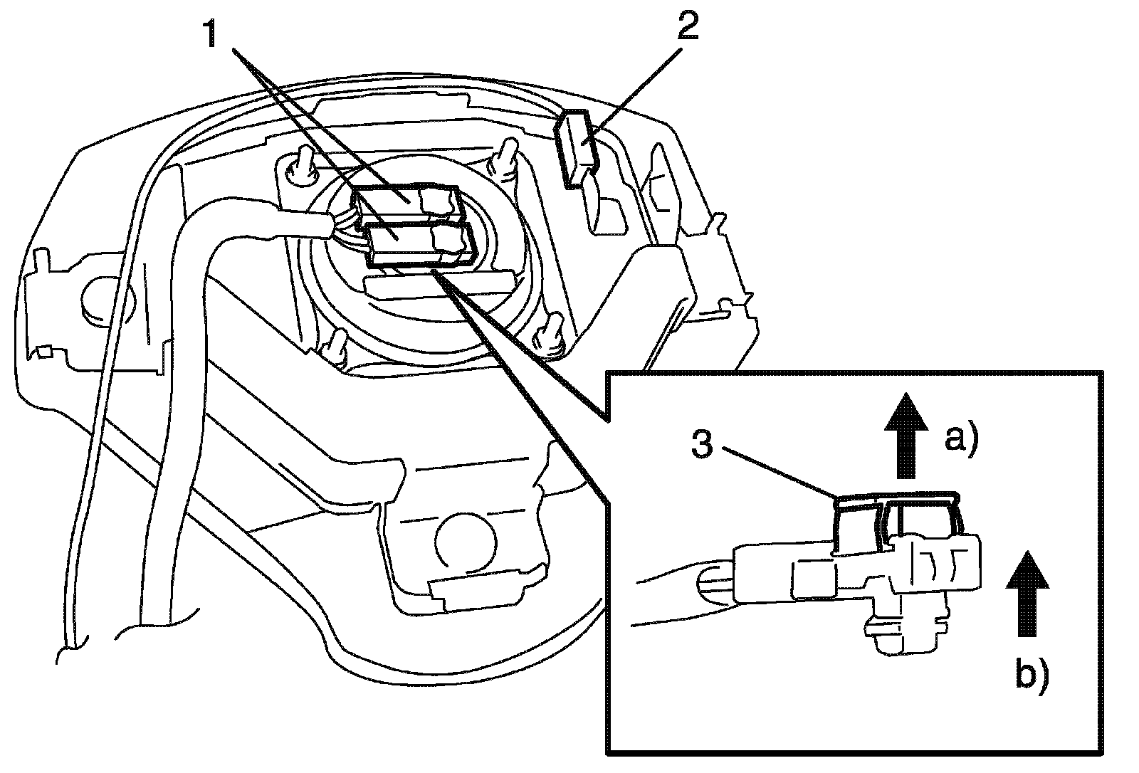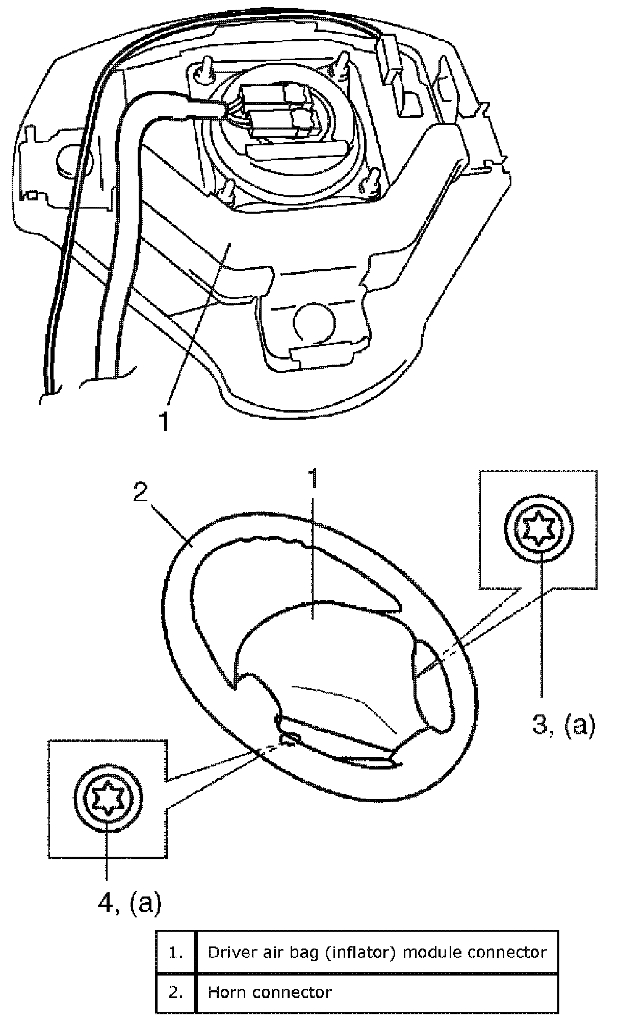 5. Disconnect driver air bag (inflator) module connectors (1) of driver air bag (inflator) module and horn connector (2) as shown in the figure.