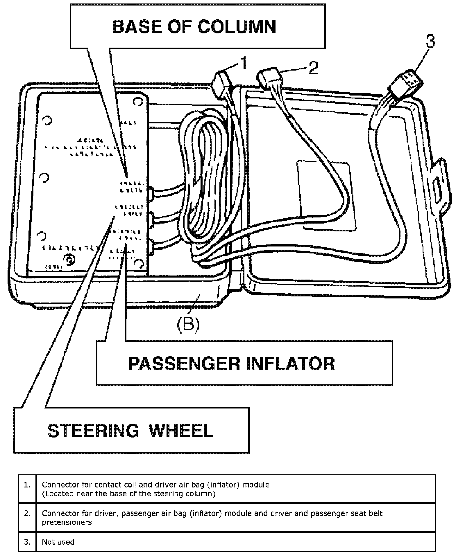 Another connector ("BASE OF COLUMN") is used to substitute the load of the driver air bag (inflator) module and the contact coil assembly when it is connected at the base of the column to the air bag wire harness.