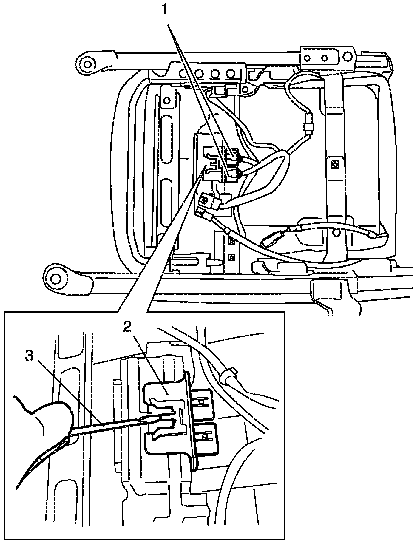 7. Using flat end rod or the like (3), remove OCM (2) from passenger seat.