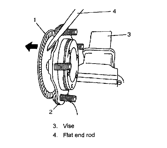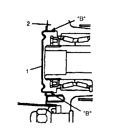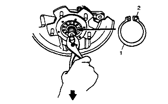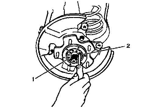 10. Remove sensor rotor (1) from wheel hub (2) as shown in the figure (if equipped with ABS).