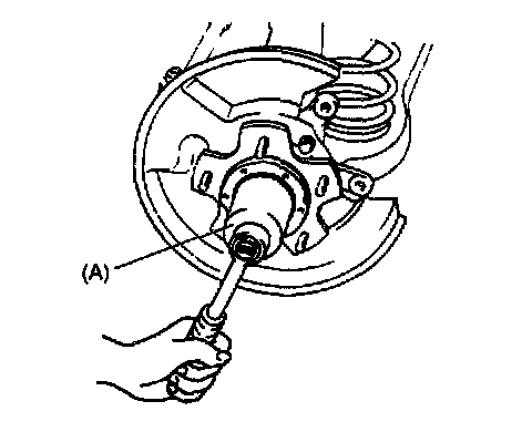 7. Remove front wheel bearing lock nut by using special tool (A).