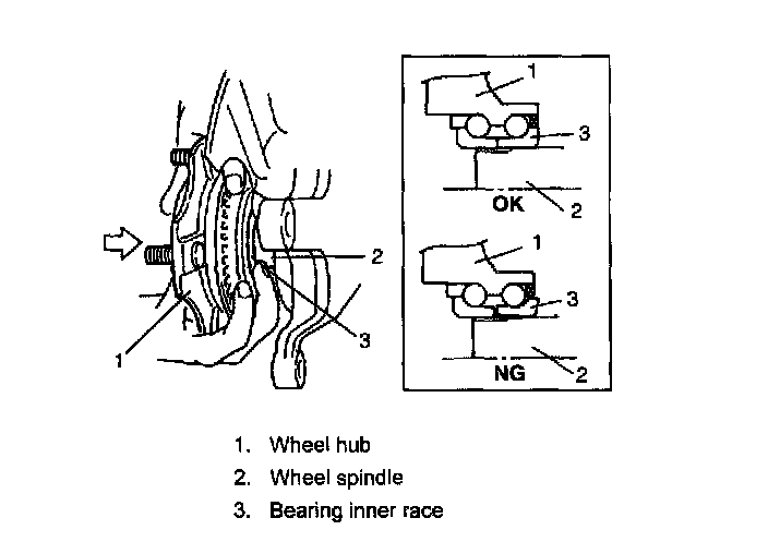 NOTE: When it is impossible to install wheel hub component by hand, which means the inner race is out of alignment, remove wheel hub component once and reinstall it.