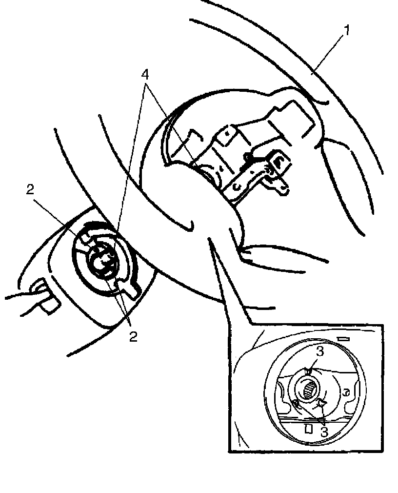 2) Install steering wheel (1) to steering shaft with 3 lugs (2) on contact coil fitted in three grooves (3) in the back of steering wheel and also aligning marks (4) on steering wheel and steering shaft.