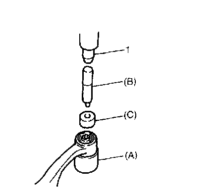 5. Remove front bushing by using hydraulic press (1) and special tools, pull out bushing.