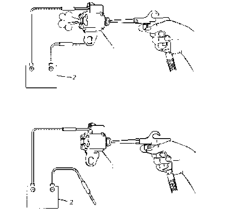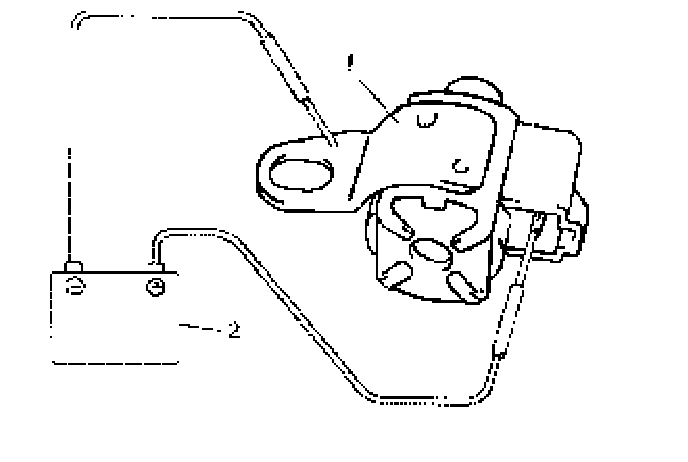 ^ With shift solenoid valve (1) not connected to battery (2), confirm that shift solenoid valve is closed by blowing air (50 - 200 kPa, 0.5 - 2.0 kgf/cm2, 7 - 28.5 psi) into solenoid valve as shown in the figure.