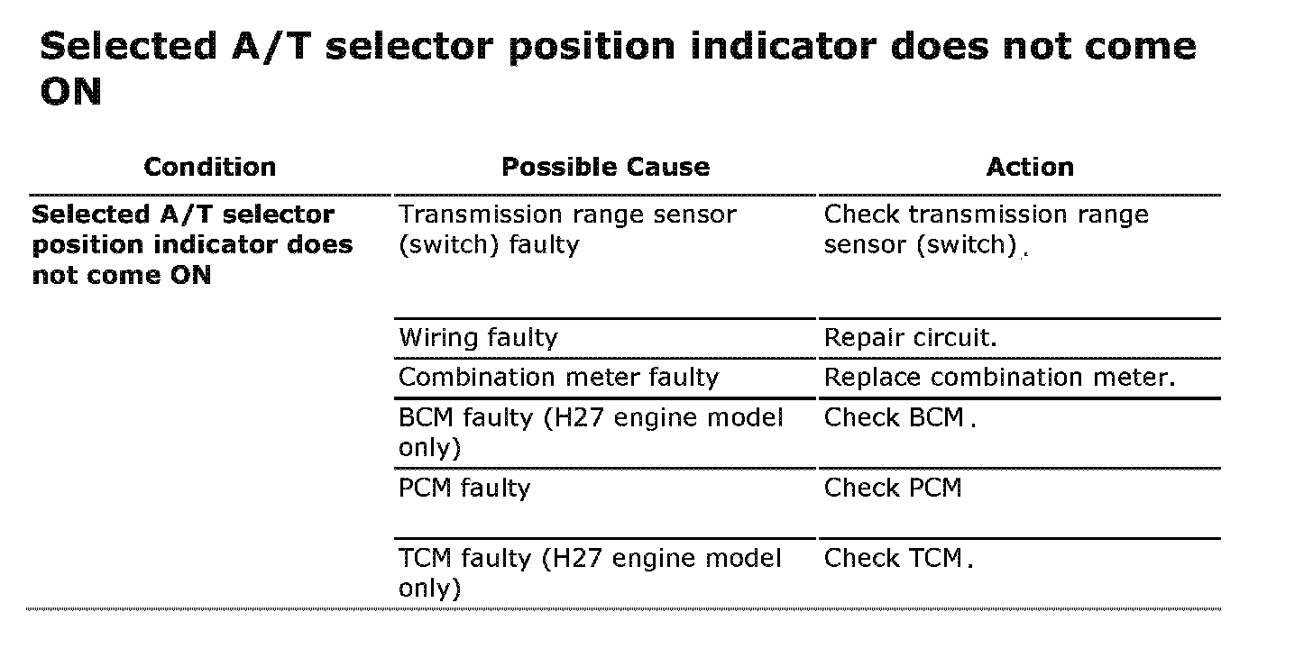 Selected A/T Selector Position Indicator Does Not Come ON
