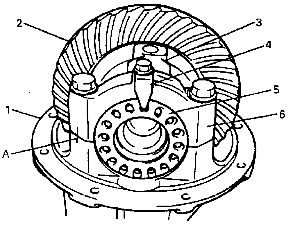 1. Hold differential assembly securely and put identification marks (A) on differential side bearing caps (6).