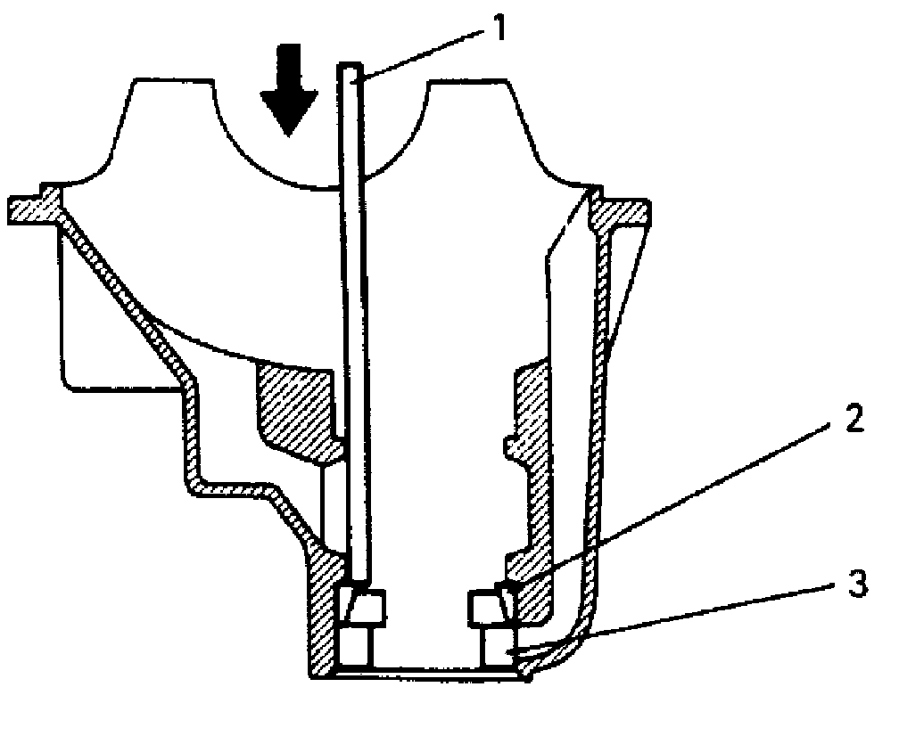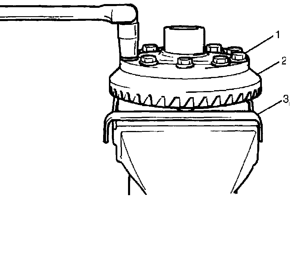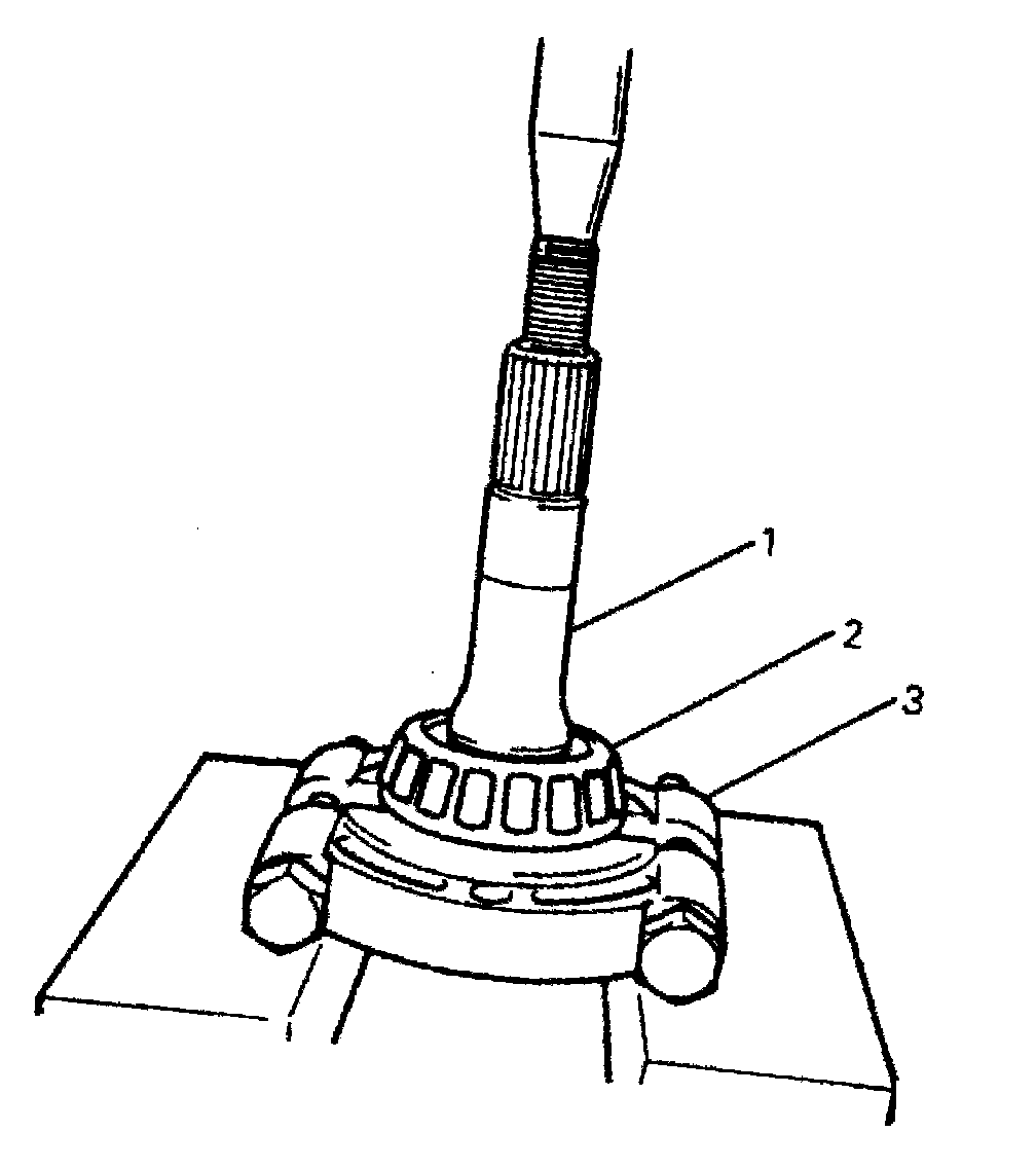 7. Using a hammer and brass bar (1), drive out front bearing outer race with bearing (2) and oil seal (3).