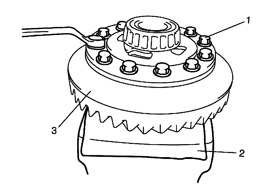 a. With aluminum plates (2) placed on vise first, grip differential case with it and remove drive bevel gear (hypoid gear) (3) by removing its bolts (1).