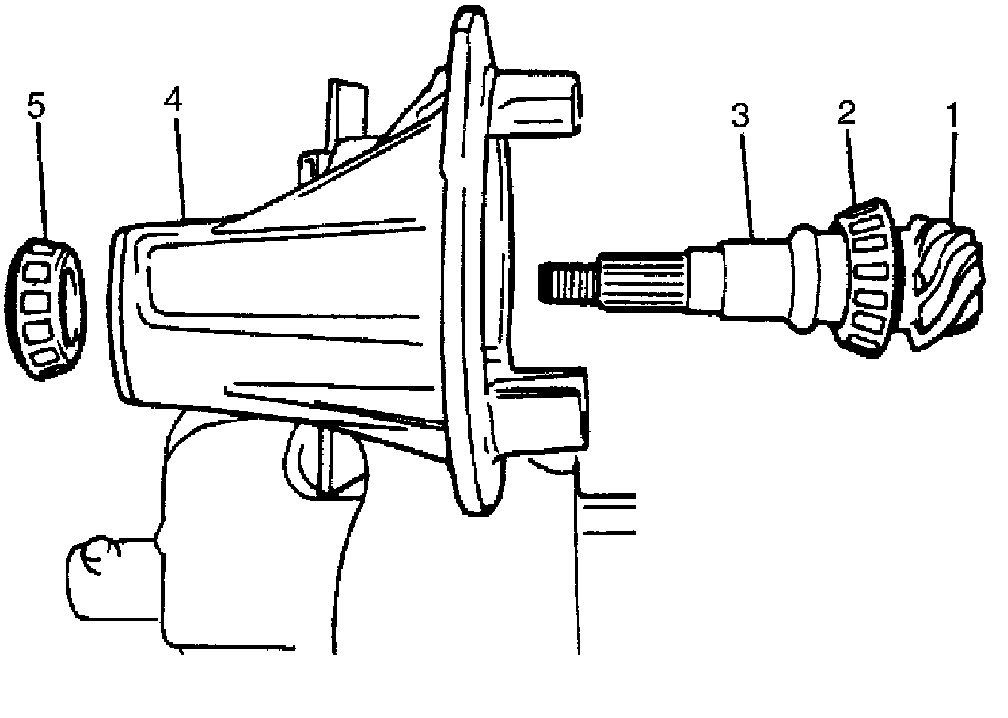 7. With new pinion spacer (3) inserted as shown in the figure, install front bearing (5) to differential carrier (4).