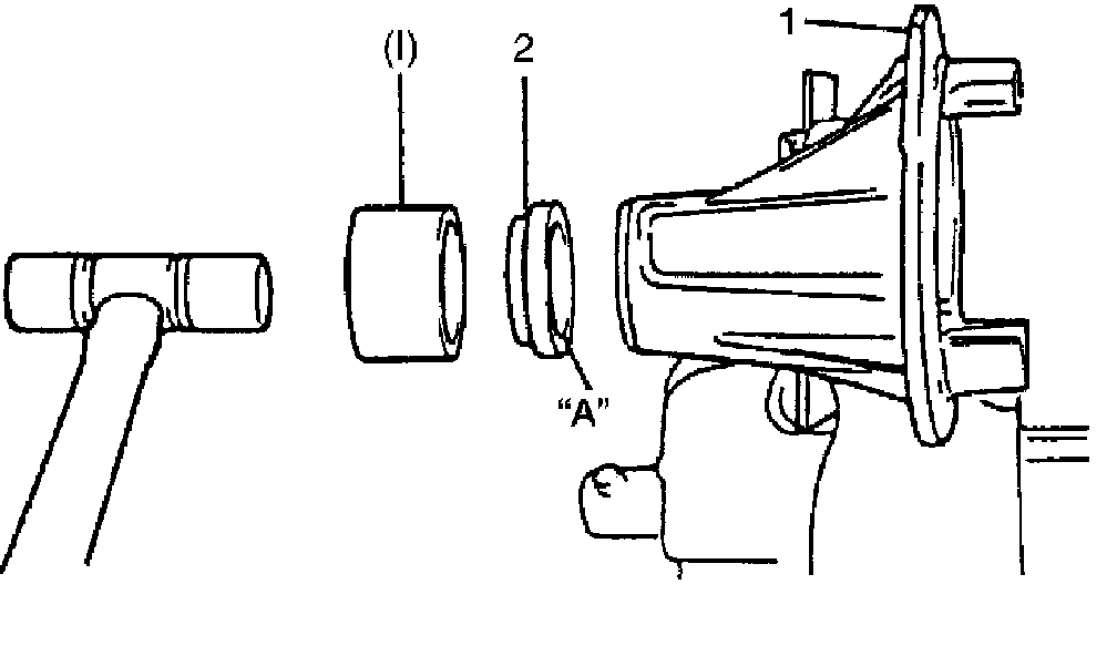 8. Using special tool and plastic hammer, drive oil seal (2) into differential carrier (1) till it becomes flush with carrier end. Then apply grease "A" to oil seal lip.