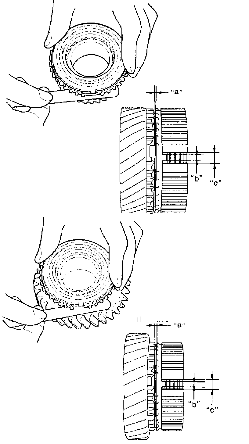 ^ Measure groove "a" of low speed gear shift fork and flange width "b" of low speed synchronizer sleeve and then calculate clearance "c" as follows: