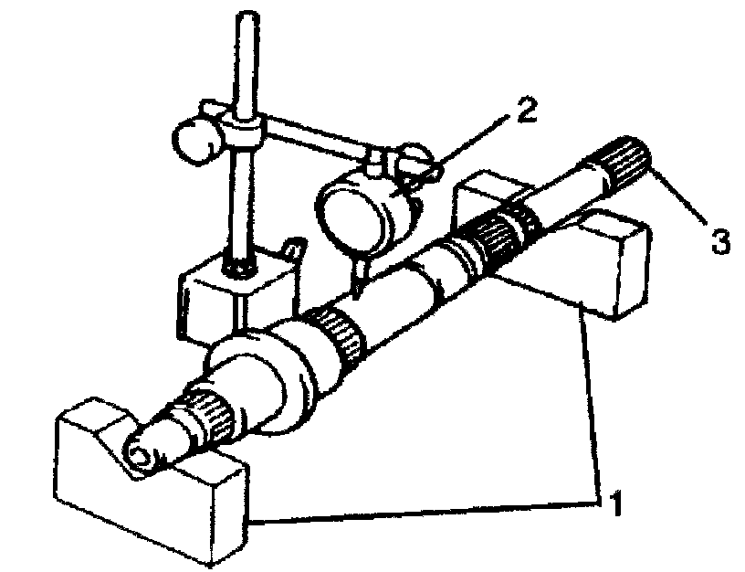 ^ Using V blocks (1) and dial gauge (2), check runout. If runout exceeds limit below, replace main shaft (3).
