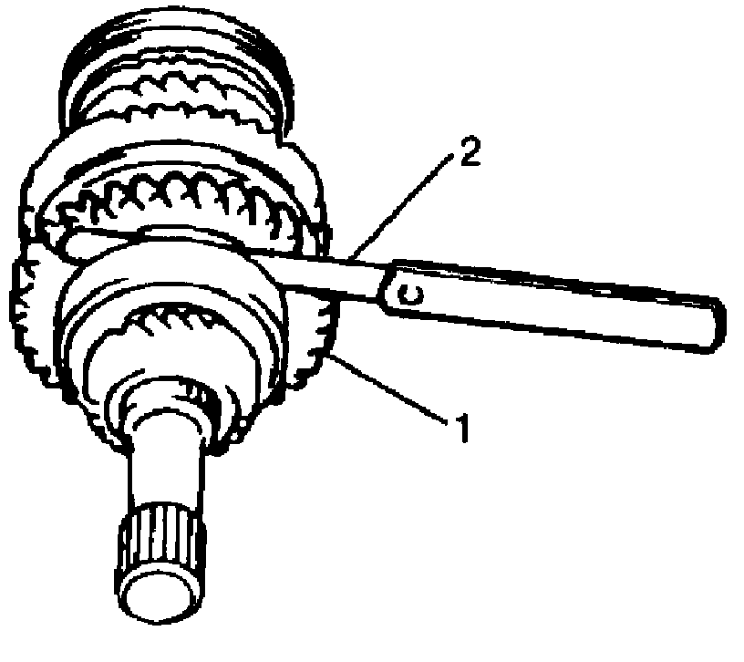 ^ Check low gear (1) thrust clearance by using thickness gauge (2). If clearance is out of specification, repress-fit or replace main shaft bearing and 5th gear.