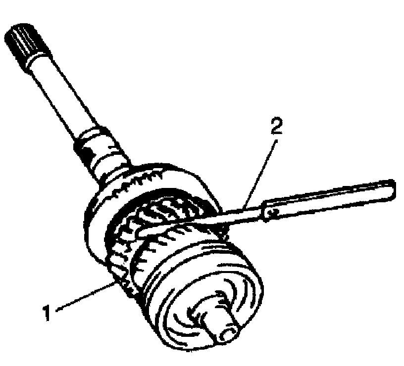 ^ Check 2nd gear (1) thrust clearance by using thickness gauge (2). If clearance is out of specification, repress-fit or replace defective part.