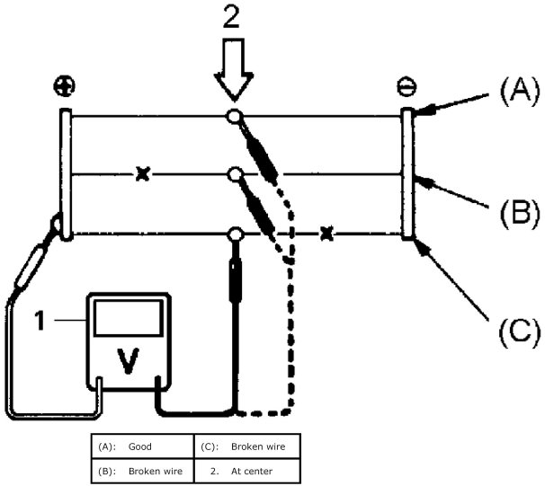 NOTE: If heat wire is free from damage, voltmeter should indicate 12 V at heat wire positive terminal end and its indication should decrease gradually toward zero at the other terminal (ground).