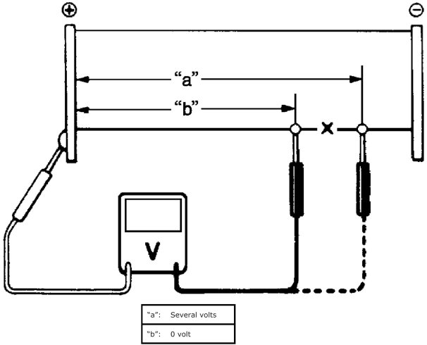 c. The place where voltmeter fluctuates from zero to several volts is where there is damage.